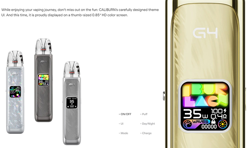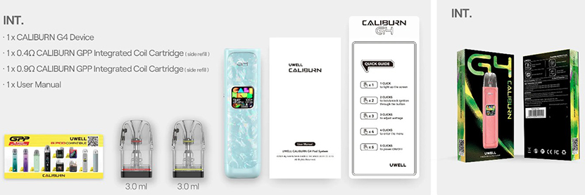 Uwell Caliburn G4 Kit, Caliburn G4'ün daha güçlü ve dayanıklı olmasını sağlayan yükseltilmiş Caliburn GPP Kartuşu ile donatılmıştır. En önemlisi, Caliburn G4 iki buharlama modu ile tasarlanmıştır: Fırtına Modu ve Dalga Modu. Fırtına Modu, buharlama isteğinizi bir saniyenin kesirinde tatmin edecek ve heyecanın tadını çıkarabilirsiniz. Dalga Modu, her saf, pürüzsüz ve istikrarlı nefesin tadını çıkarmanıza yardımcı olacaktır. Uwell Caliburn G4 Kit, hava akışı kontrolü, 0,85 inç HD renkli ekran ve 1300mAh pil kapasitesine sahiptir. Yükseltilmiş Caliburn GPP Kartuşu, sızıntı önleme performansını artırmak için ultrasonik kaynaklama, hava akışı performansını iyileştirmek için U şeklinde kanal tasarımına sahiptir.