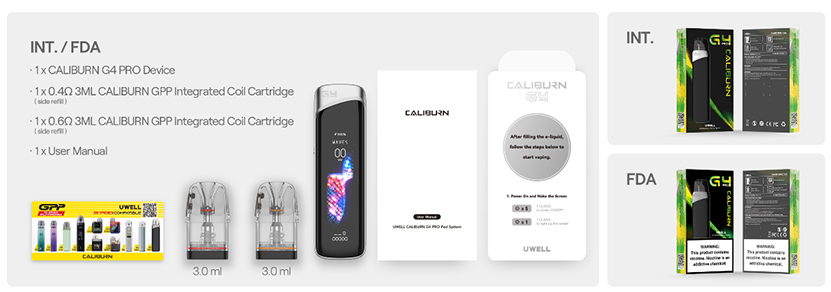 Uwell Caliburn G4 Pro Kit, temel işlevlere tek bir dokunuşla erişilebilen, çalışmayı basitleştiren çığır açan bir dokunmatik ekran kullanıcı arayüzüne sahiptir. 2,51 inçlik ultra kırılmaz bir ekranla donatılmıştır ve 6 ilgi çekici kullanıcı arayüzü teması sunar; 3 kullanılabilir ve 3 kilitli. Watt değerini ayarlayabilir, çıkış modunu değiştirebilir, nefes sayacını sıfırlayabilir, 8 dil arasından seçim yapabilir, çok işlevli klavyeyle cihazı yeniden adlandırabilir ve parlaklık/ekran zaman aşımı ayarı, animasyon geçişi ve pil tasarrufu gibi diğer kullanışlı ayarlara sahiptir. Fırtına/Dalgalar/Özel Modlar mevcuttur. Özel Mod ile her nefesin Başlangıcında, Ortasında ve Sonunda gücü ince ayarlayarak mükemmel vape'inizi yaratabilirsiniz. Kademesiz hava akışı kontrolü vaping'inizi bir şekilde kişiselleştirir. Caliburn G4 Pro, 35W maksimum güce sahip dahili 1800mAh pil ile çalışır. Dağınıklıksız çekim için U² sızıntı önleme teknolojisini benimseyen hem önceki hem de yükseltilmiş GPP Kartuşuyla uyumludur. Ayrıca daha yumuşak ve rahat bir çekim için ergonomik ve konturlu ağızlığa sahiptir.