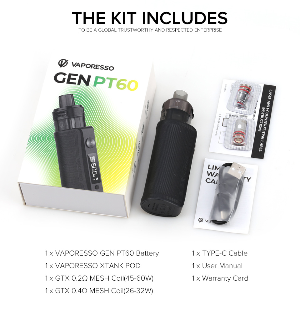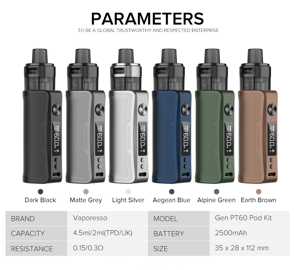 GEN PT60 , DTL kullanıcıları için tasarlanmış yeni bir pod modudur. Çift Üst Sistemli yeni XTank pod ve altta SSS Sızıntıya Dayanıklı Teknoloji 2.0 ile donatılmıştır ve sızıntı direnci için Quadra koruması sağlar. Yeni geliştirilen COREX - bir lezzet artırıcı teknoloji, yapı ve malzeme yeniliği ile GTX coilinin lezzetini ve ömrünü %30 artırır. Ayrıca tüm coil platformuyla tam uyumlu olabilir. Dışarıdaki zarif his ve içindeki akıllı mod, onu yeni DTL başlatıcılar için yeterince şık ve kullanımı basit kılıyor.